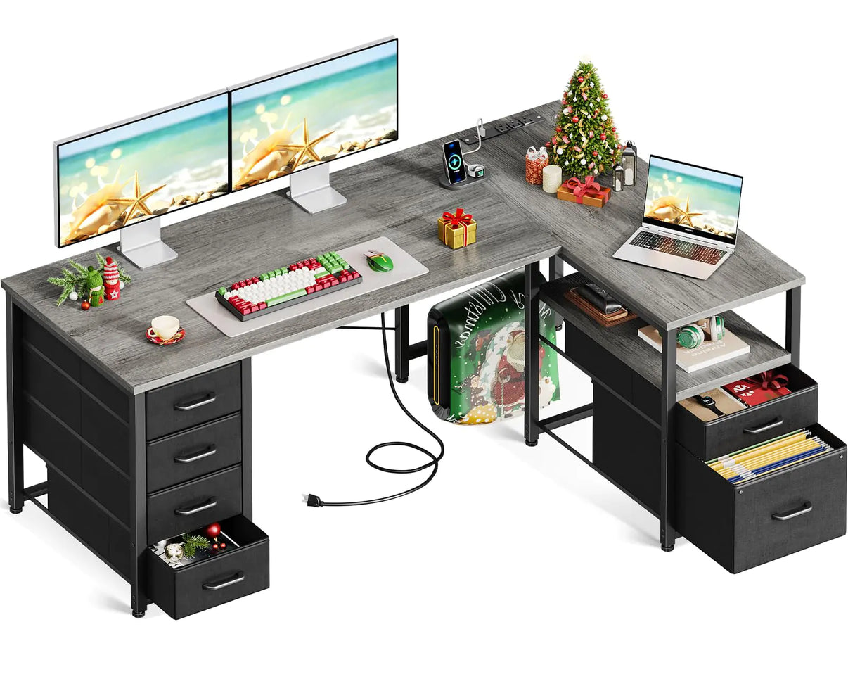 Coles home L Shaped Computer Desk with 6 Drawers & Power Outlet 55 Inch Enhance your work from home experience with the Coles home L Shaped Desk, perfect for any corner of your home office. 🏠 Equipped with built-in power outlets including 3 AC, 1 USB, and 1 Type C port, it allows you to easily charge devices and keep everything within reach while you work or game. Ample Storage: Equipped with six fabric drawers and an additional file drawer, this desk offers extensive storage for all your office supplies or gaming equipment, keeping them organized and dust-free. The side storage...