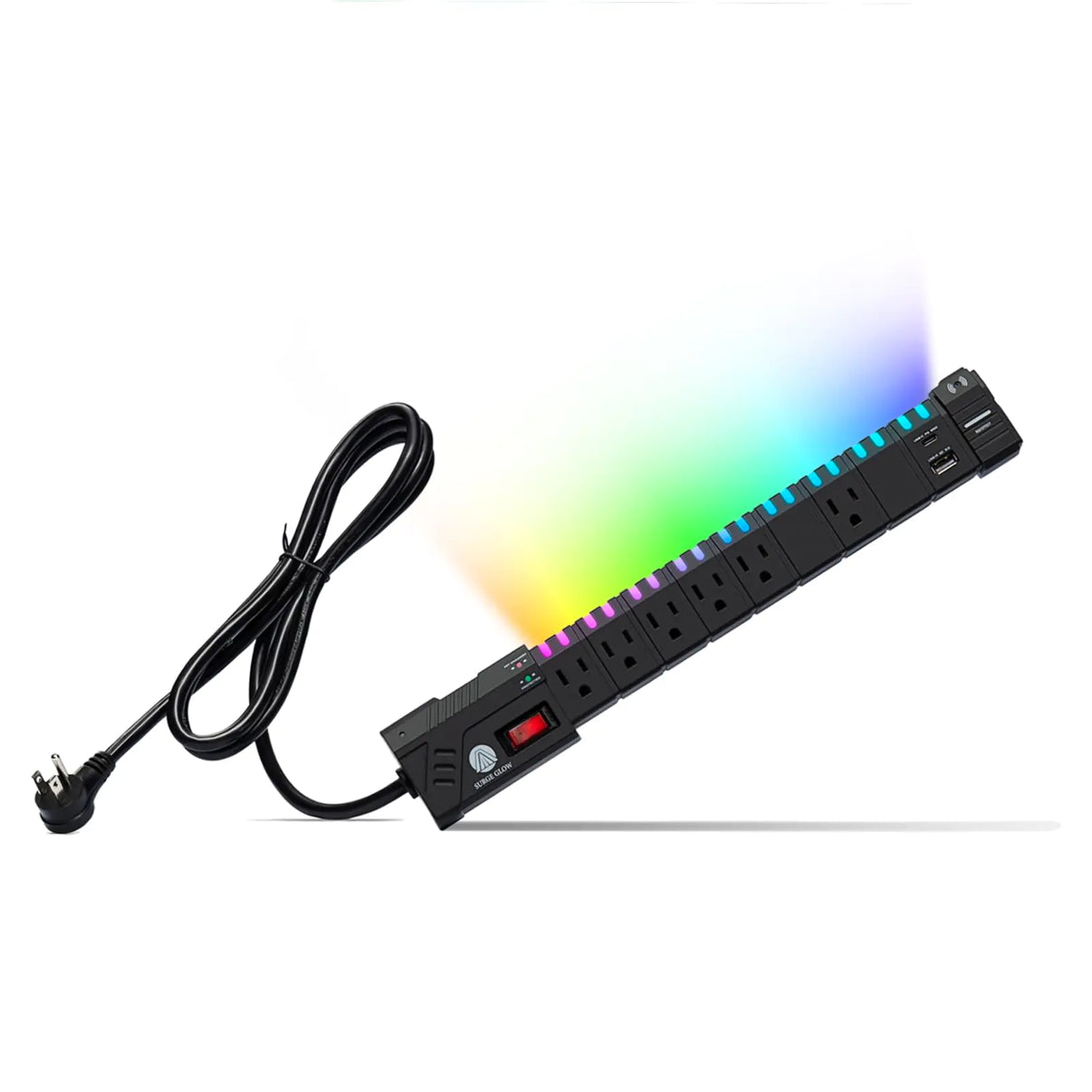 Equipped with robust surge protection (4200 Joules, 1800W), this power strip effectively safeguards your devices from voltage fluctuations and lightning, featuring overload protection that automatically cuts power to prevent accidents. Experience interactive gaming with 6 RGB color modes and 4 sound-reactive rhythm settings, customizing your room's ambiance while immersing in gameplay. Its efficient and stable output, enhanced by a GaN QC3.0 chip, offers PD 20W fast charging to efficiently power up phones, tablets, and laptops. The widely spaced outlets accommodate multiple devices, reducing plug interference and optimizing space. Plus, the sensitive built-in mic transforms this power strip into an atmospheric...
